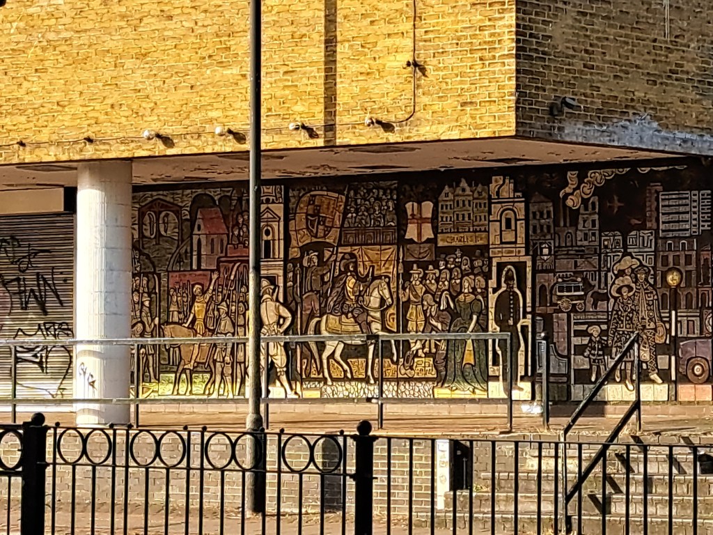 Significant sights along the way today were the North Peckham civic centre (now the church of everlasting arms) with amazing mosaics featuring Chaucer’s pilgrims, but sadly, these are poorly preserved. Next to this odd building is the longest pub sign in London which no longer has a pub below it and has been declining steadily ever since we first noticed it about 10 years ago.