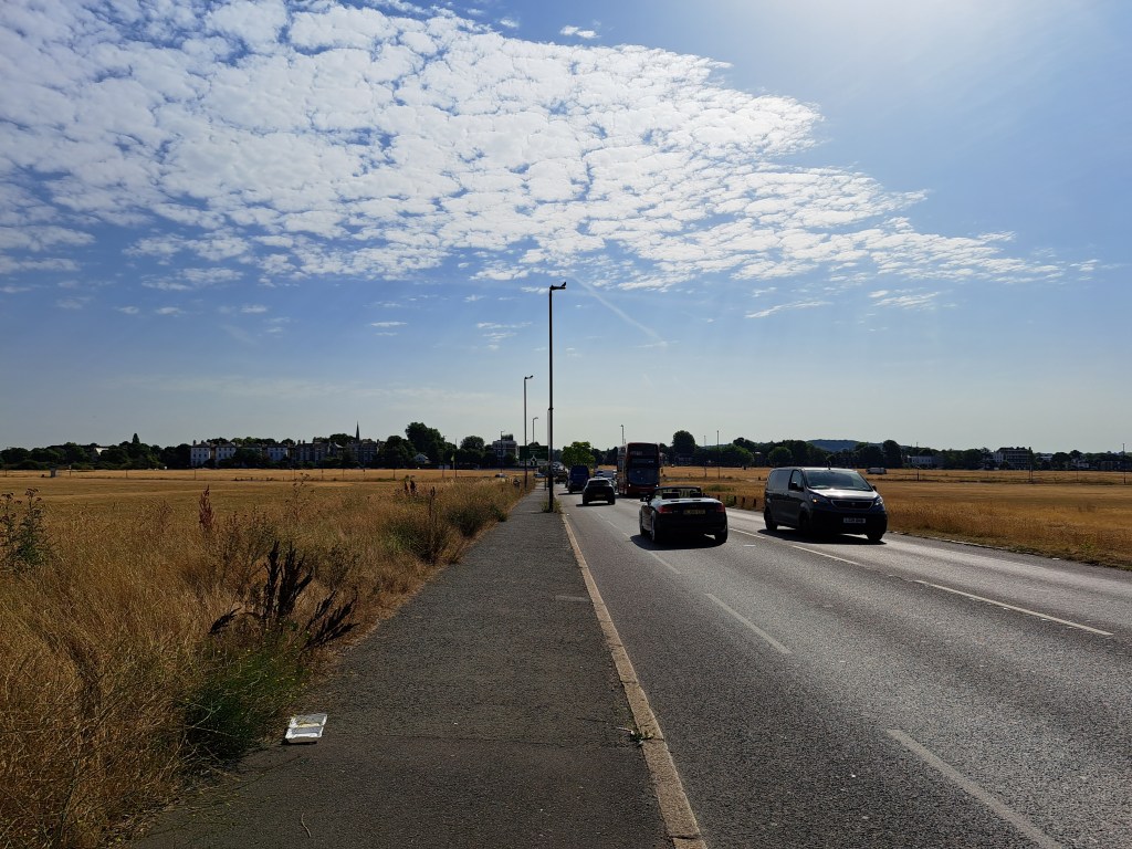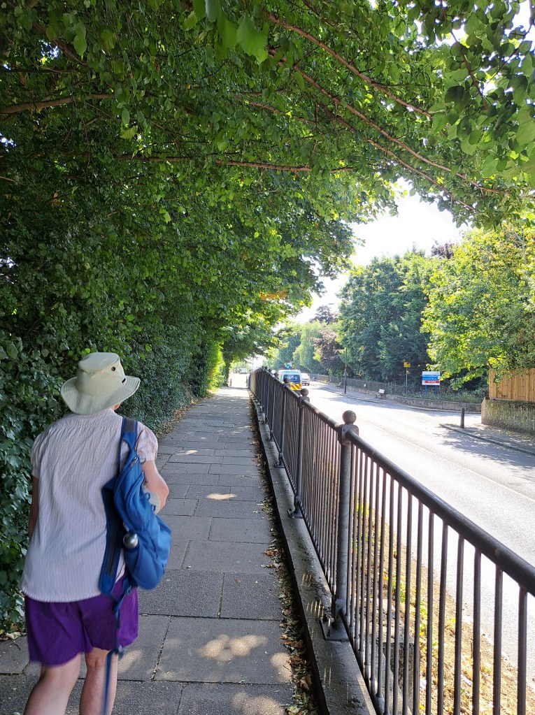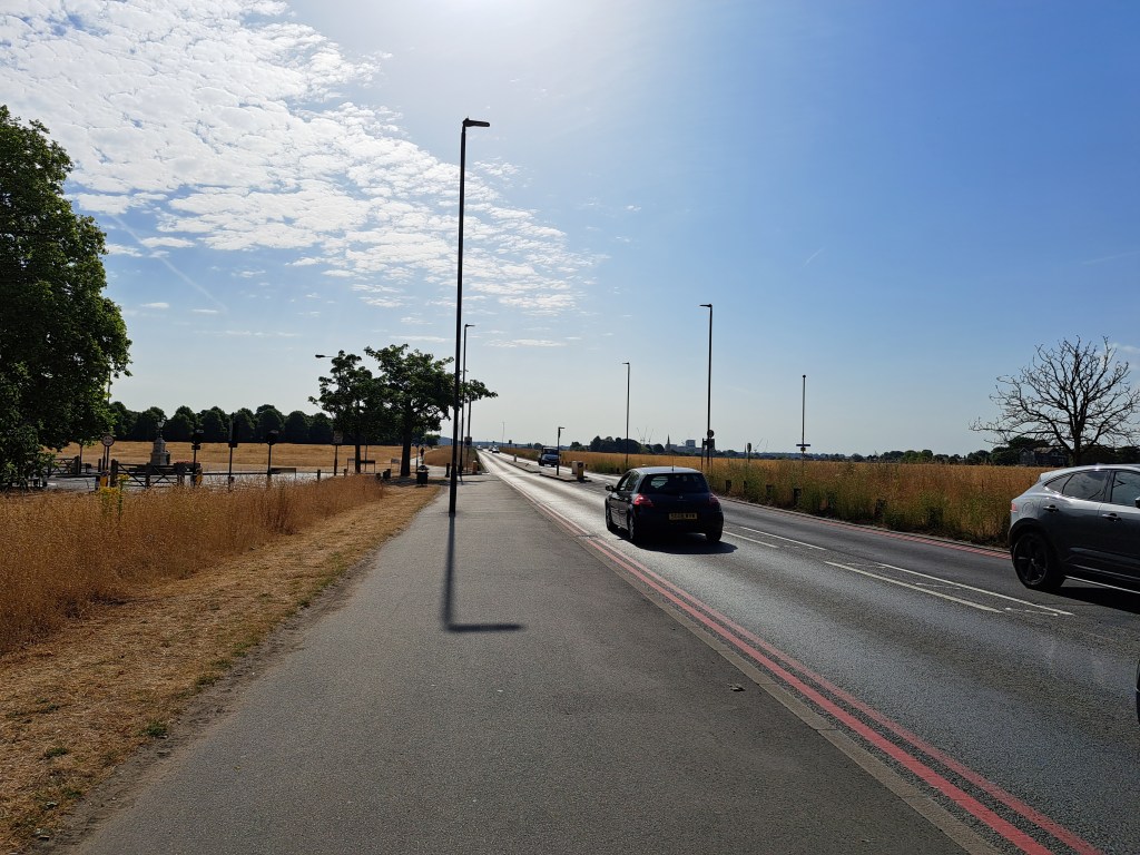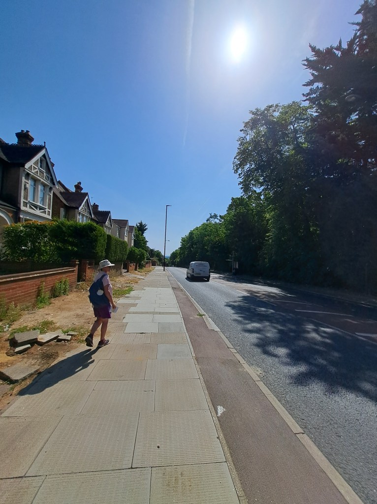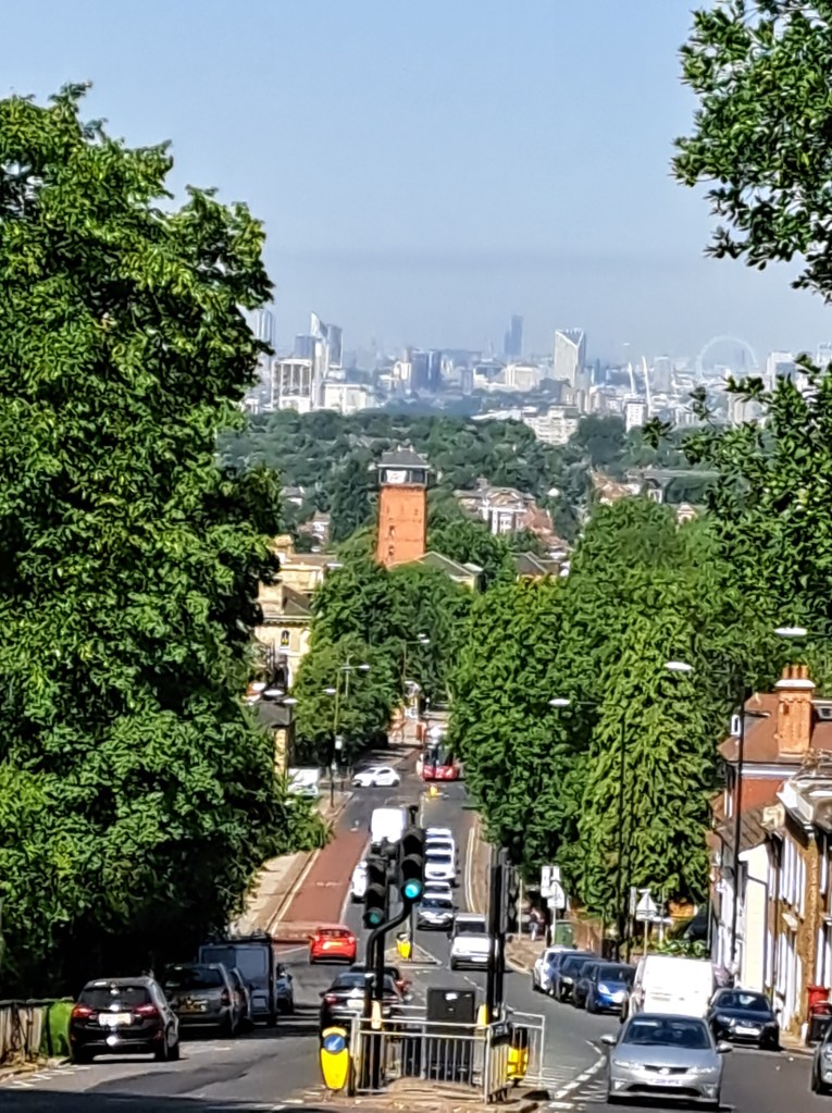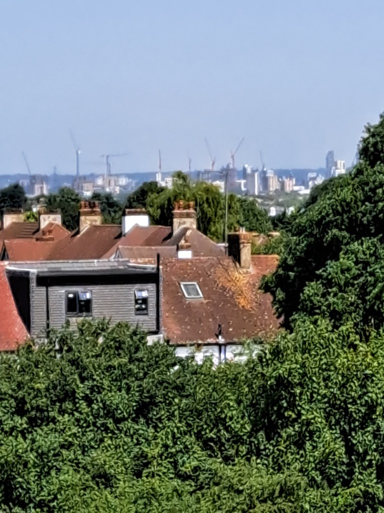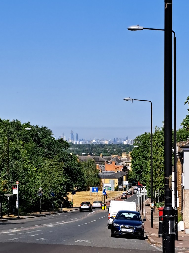 After Deptford we began to climb Shooters Hill which is probably London’s longest hill. It does it in a mix of long steady inclines and a couple of steep slopes. It cuts across Black heath, which is lovely but, when you get to the very top (near the Bull pub) you can turn back and glimpse a fabulous view of central London. Not in my photo from that spot the dark line above the city. That shows the pollution held over the centre of London as a thick, dense layer…. We were well beyond it when this was photo was taken.
