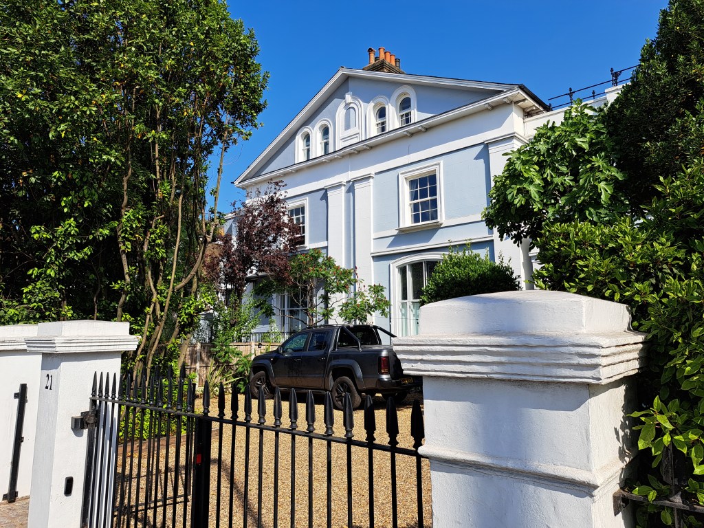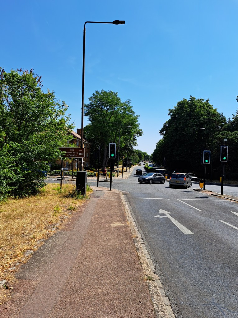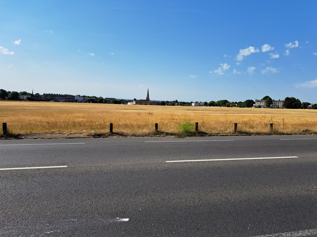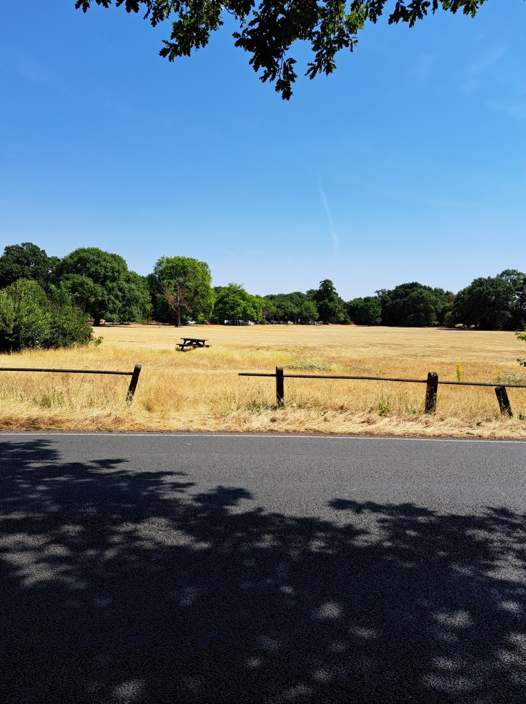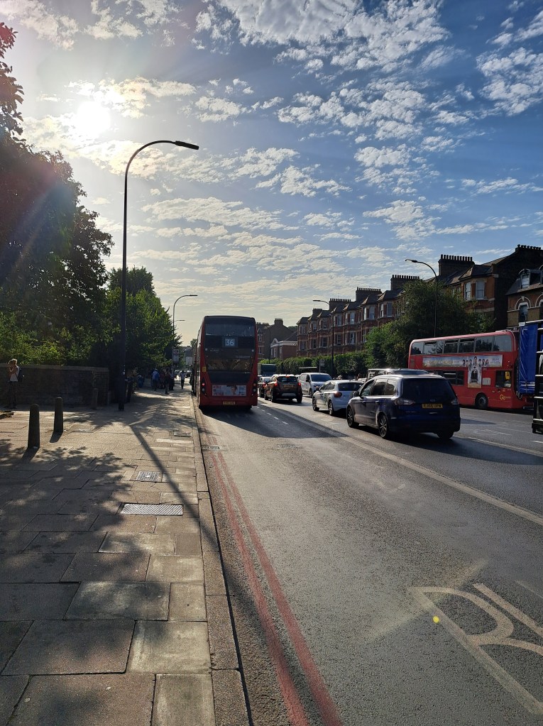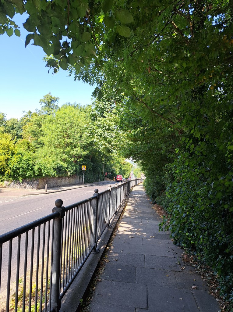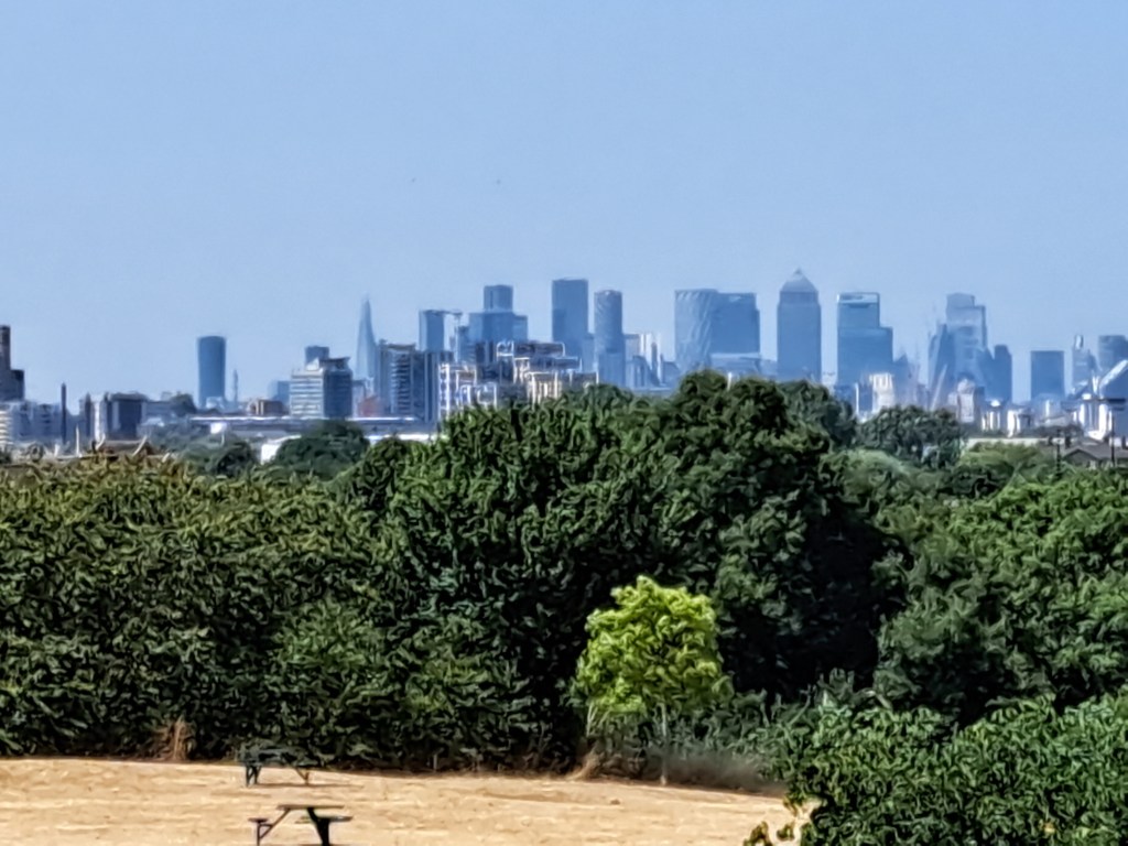 After Deptford we began to climb Shooters Hill which is probably London’s longest hill. It does it in a mix of long steady inclines and a couple of steep slopes. It cuts across Black heath, which is lovely but, when you get to the very top (near the Bull pub) you can turn back and glimpse a fabulous view of central London. Not in my photo from that spot the dark line above the city. That shows the pollution held over the centre of London as a thick, dense layer…. We were well beyond it when this was photo was taken.