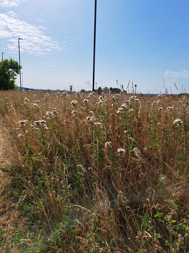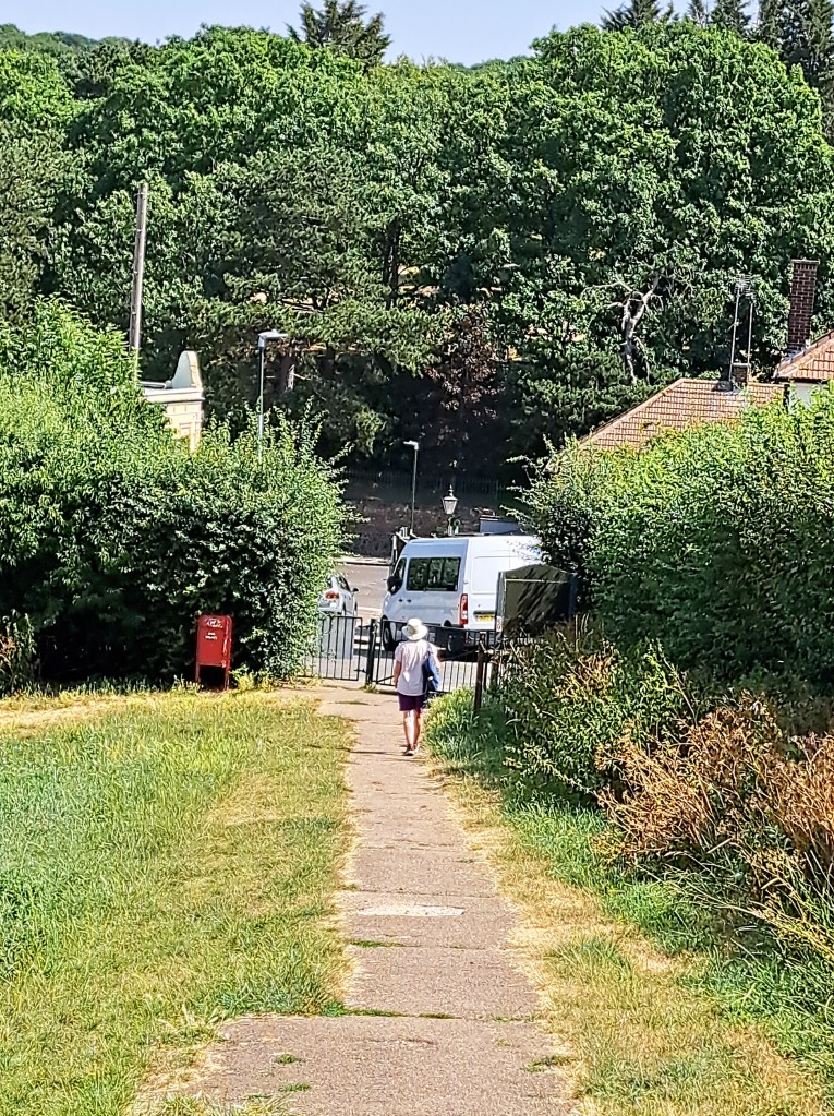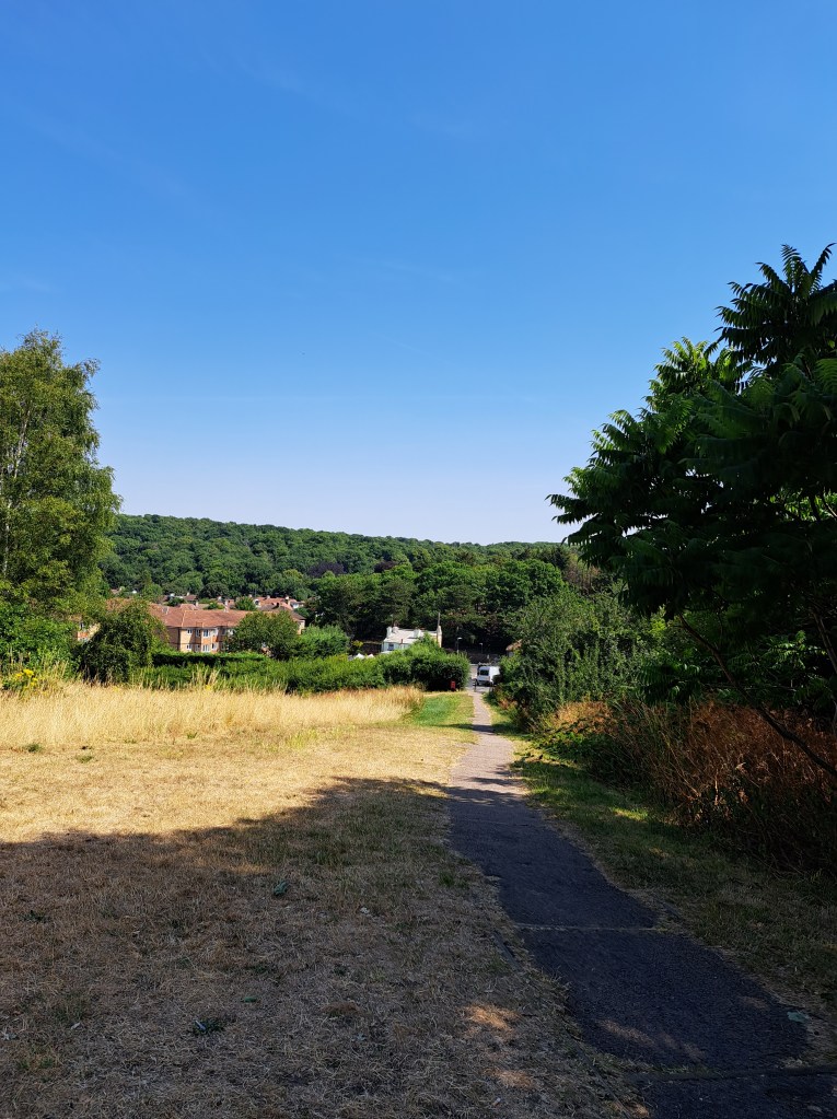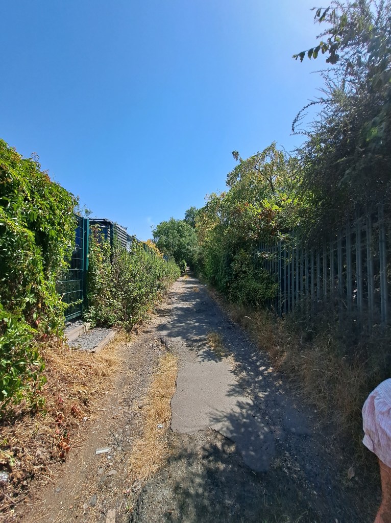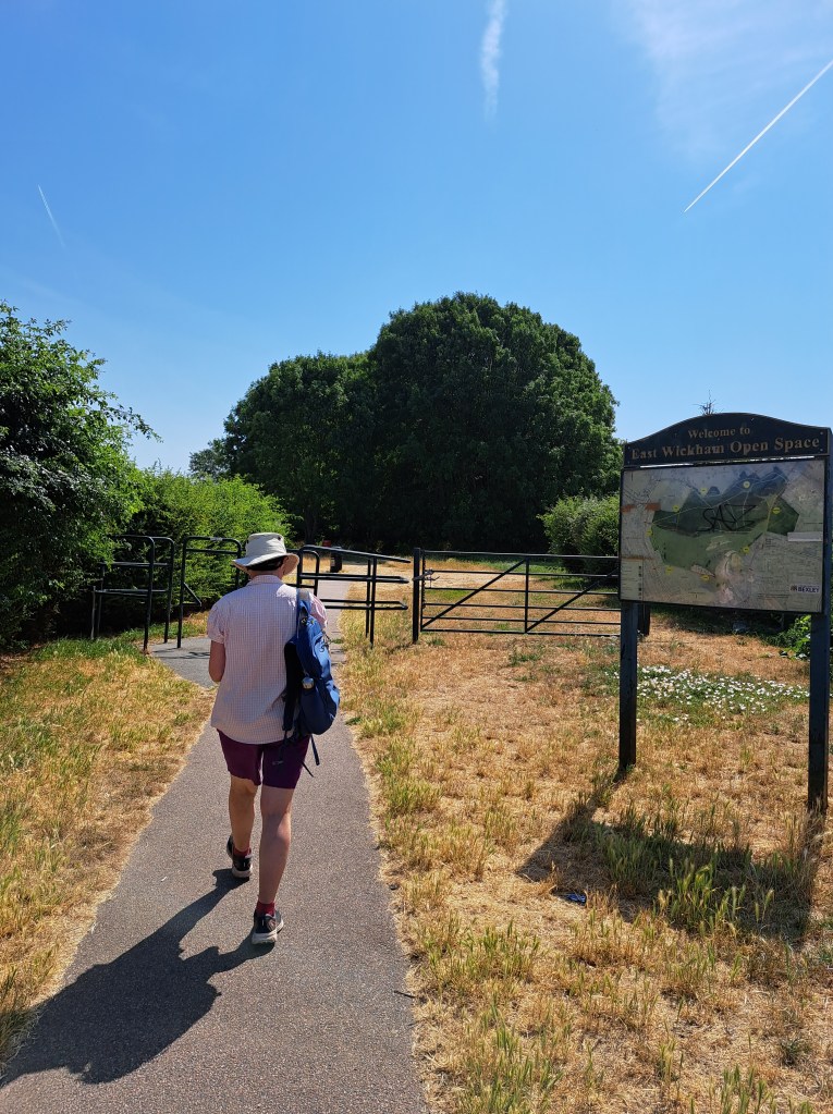 The day was really varied, starting with really urban walking, then over a great London heath and eventually through a council estate and mixed suburbia. Then we dropped into a couple of large wooded areas and some wide open spaces with parched, yellow grass, and after an encounter with ancient ruins that allowed us another long view of the city, we were into a very mixed, urban backwater that eventually brought us to Erith train Station. The last sign I photographed was at the beginning of a neglected dead end side road, but it lifted our spirits… I hope these photos give you an idea of the day.