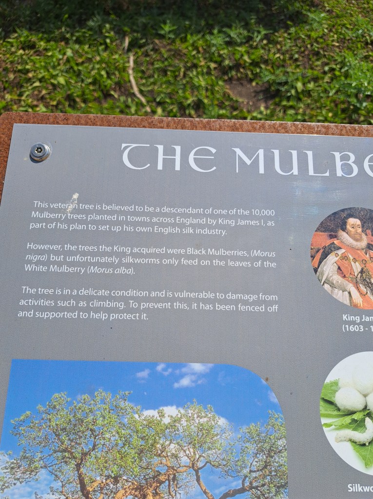 In the Abbey grounds there is an ancient mulberry tree planted in time of King James the 1st of England (6th of Scotland). His big idea for this and a very large number of other Mulberries was for the nation to get into the silk trade. Sadly, Silk worms don’t eat black mulberry leaves, they eat the leaves of white mulberry trees…. Ho hum.