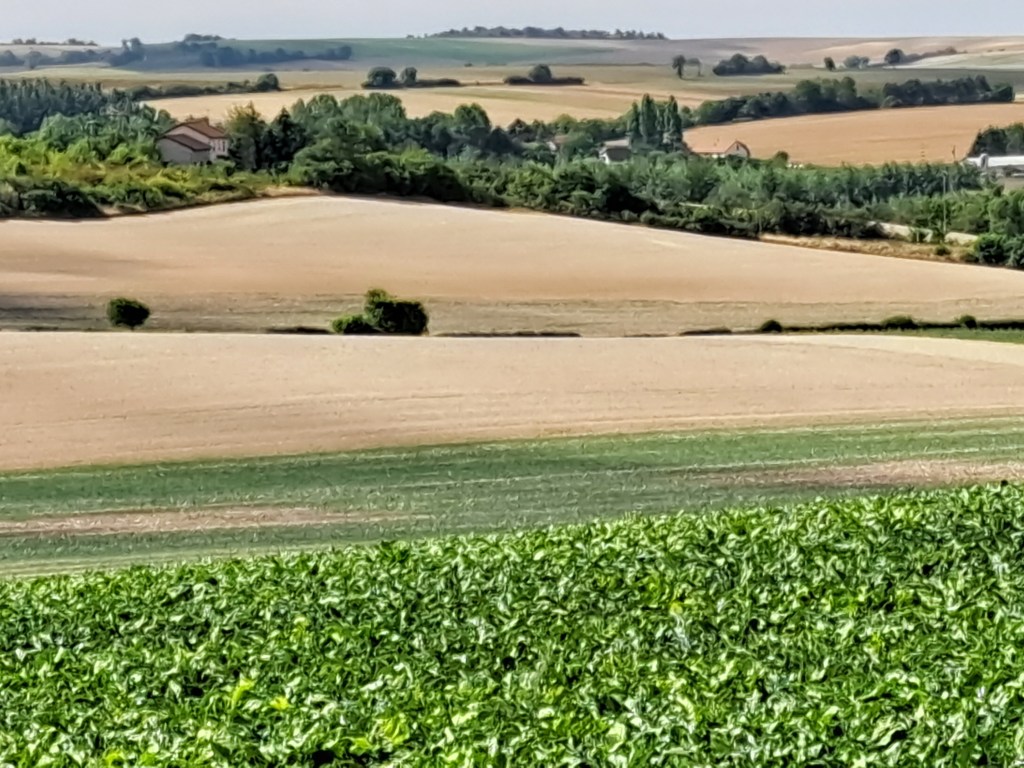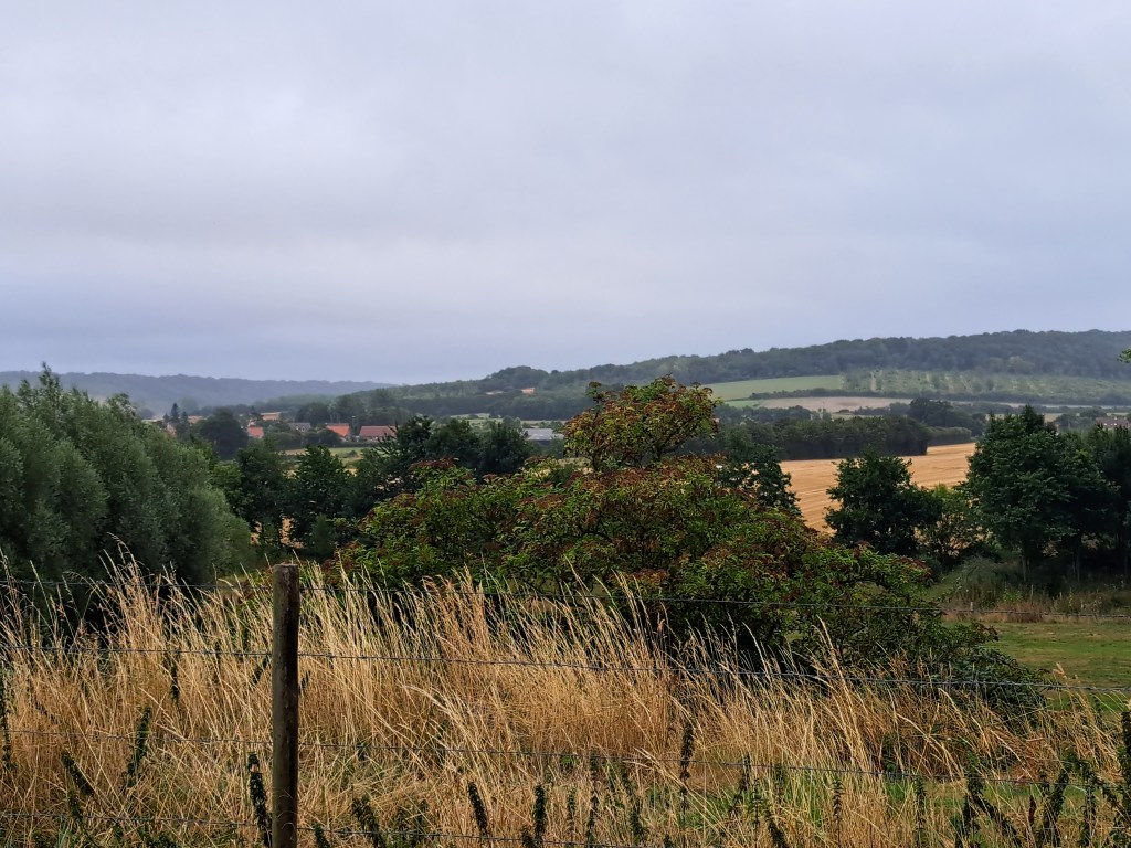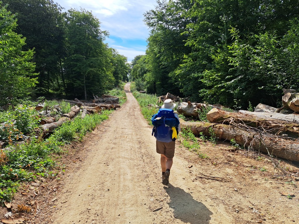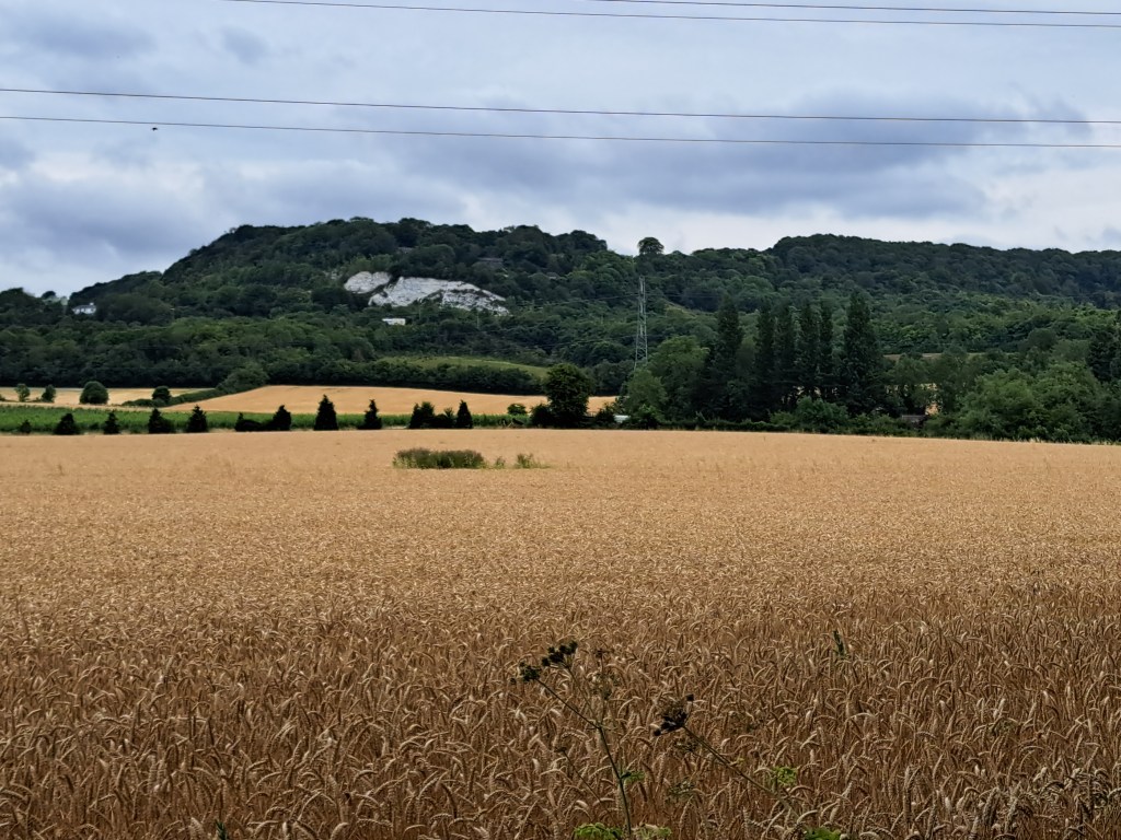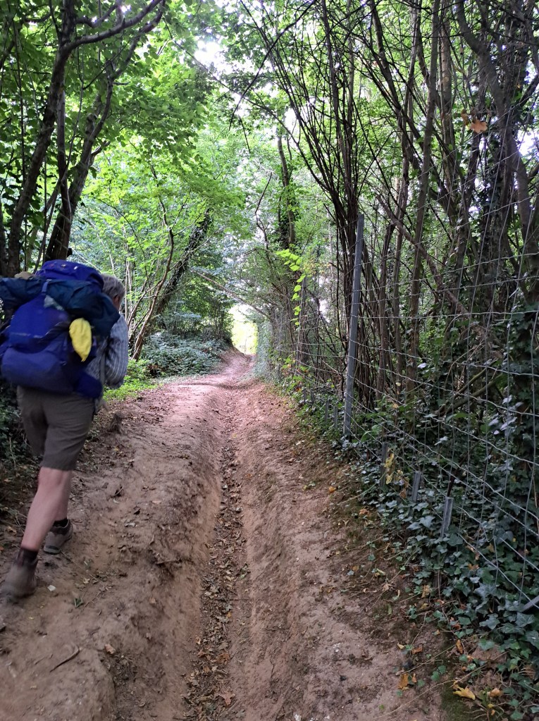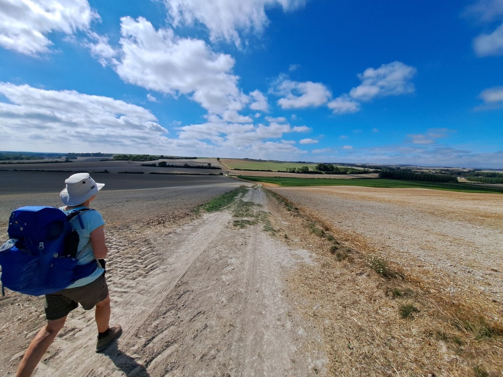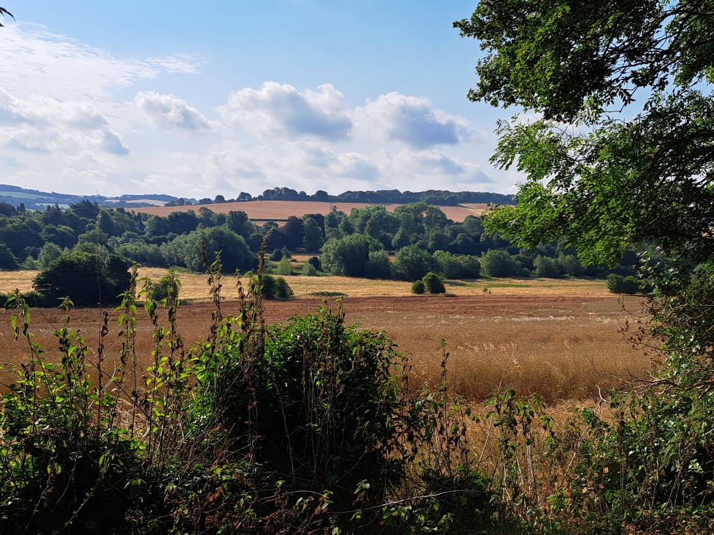 After long stages in forests and a few bouts beside large cultivated fields we found ourselves on the edge of an escarpment with great views along the valley below. So good to have a broader view of the world after hours enclosed in forests. I love forests and find them peaceful and quite mysterious, but the stepping out to a wider vista was very satisfying. I suppose the fact that I had been suffering from the very course and uneven paths liberally strewn with flint nodules and sharp, broken shards, helped make the break out feel so good.