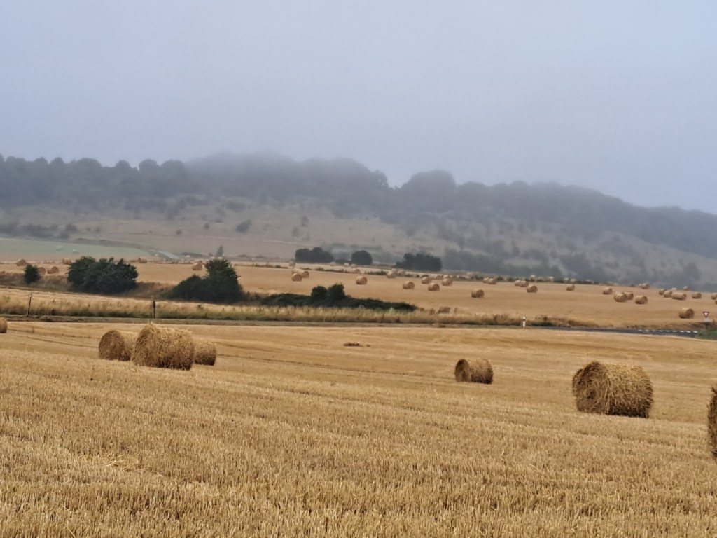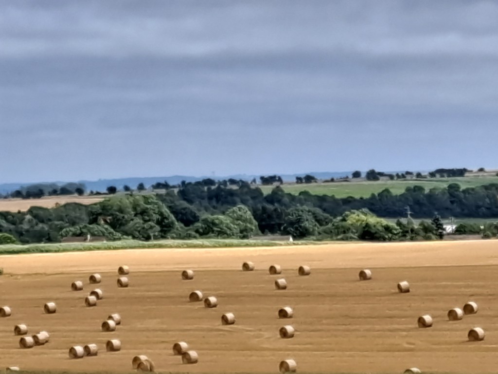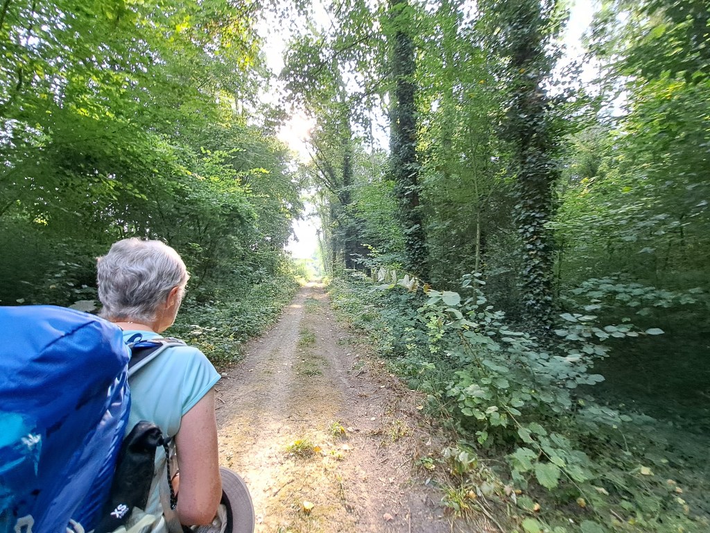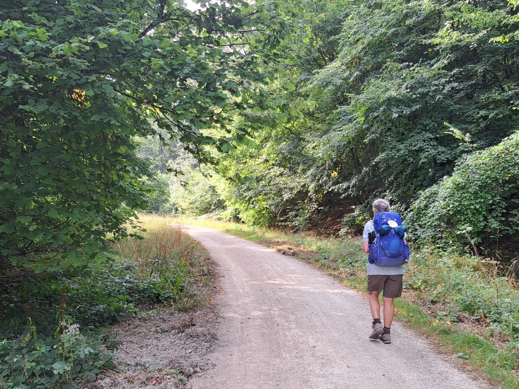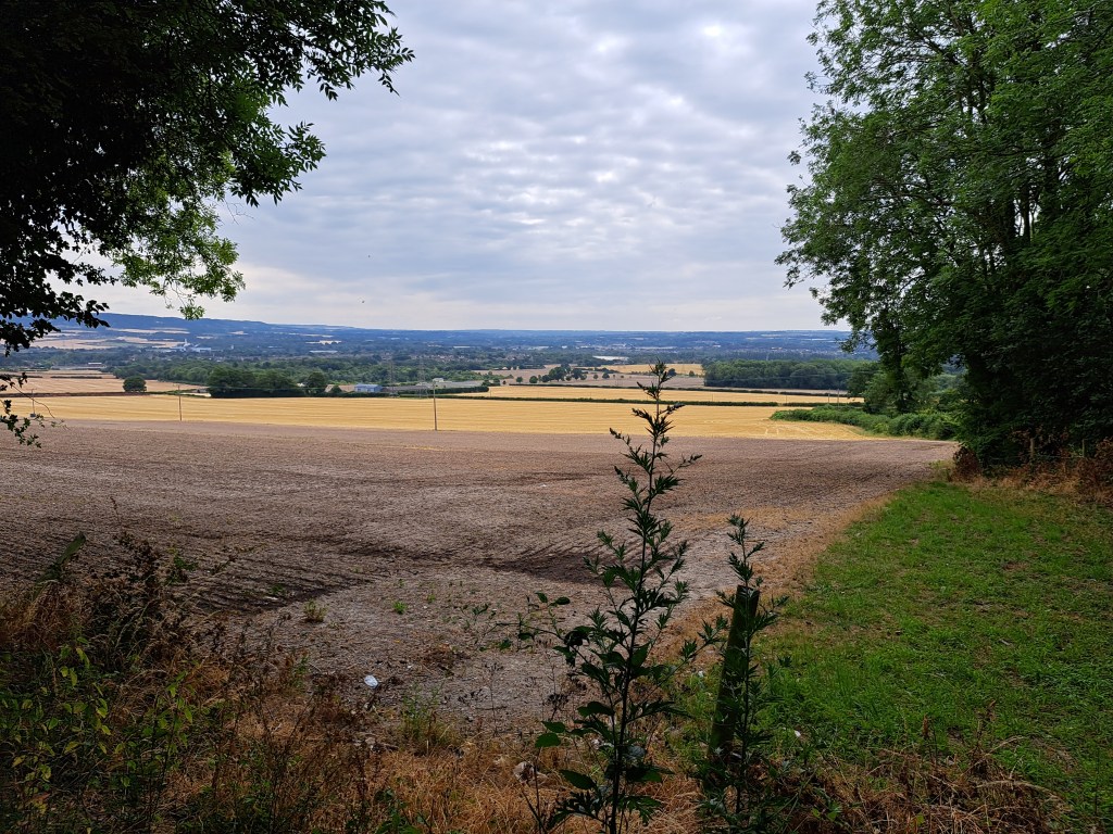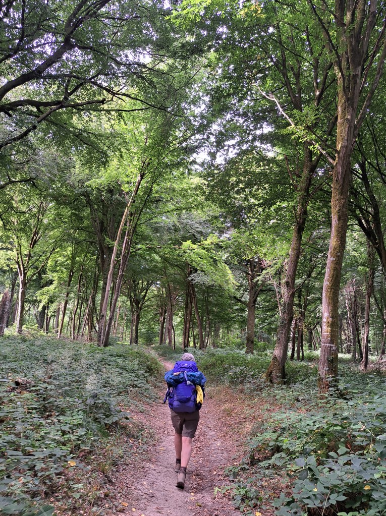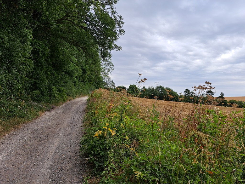 After long stages in forests and a few bouts beside large cultivated fields we found ourselves on the edge of an escarpment with great views along the valley below. So good to have a broader view of the world after hours enclosed in forests. I love forests and find them peaceful and quite mysterious, but the stepping out to a wider vista was very satisfying. I suppose the fact that I had been suffering from the very course and uneven paths liberally strewn with flint nodules and sharp, broken shards, helped make the break out feel so good.