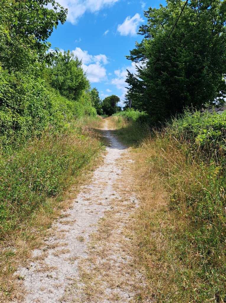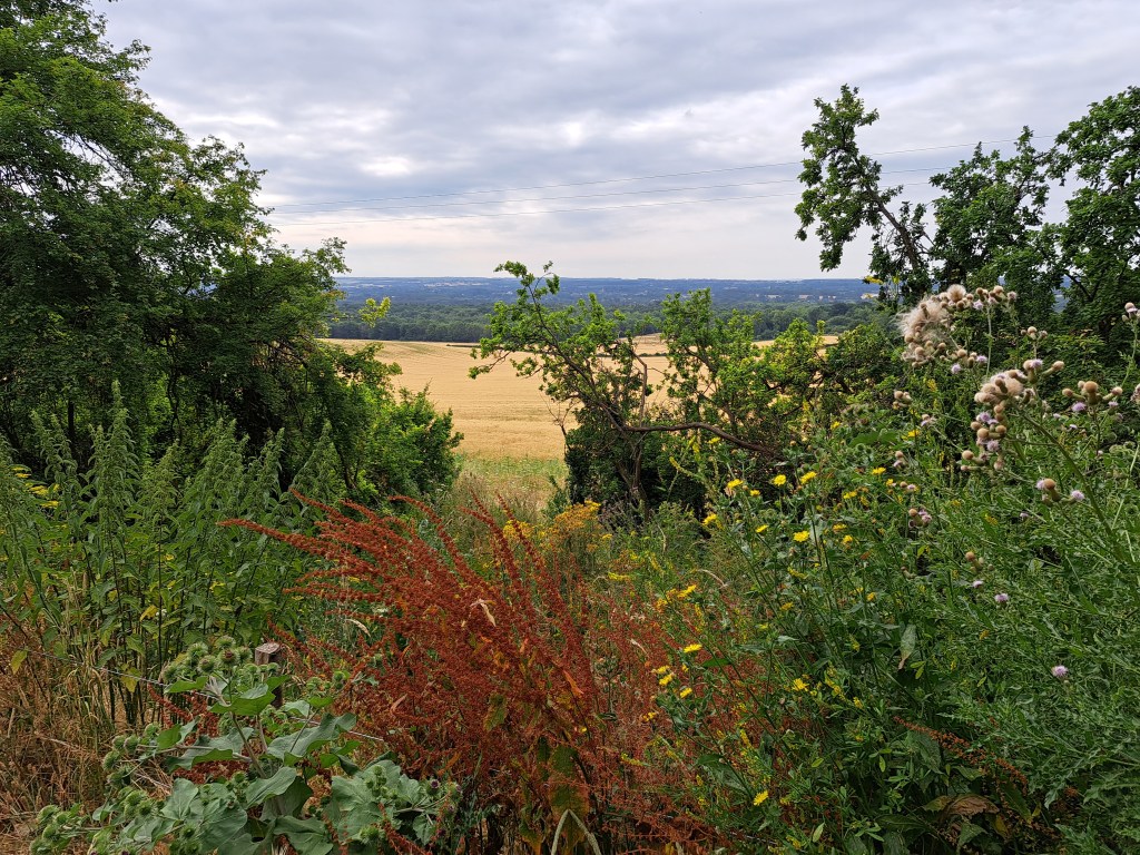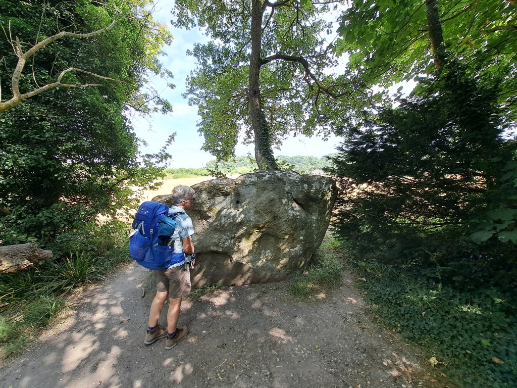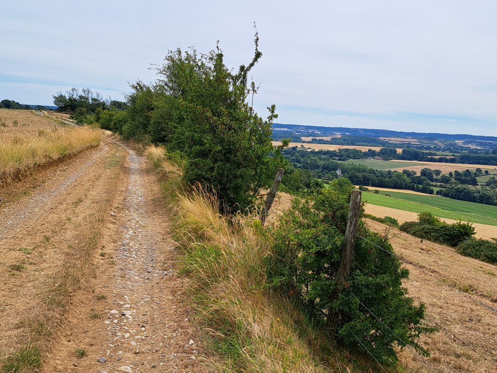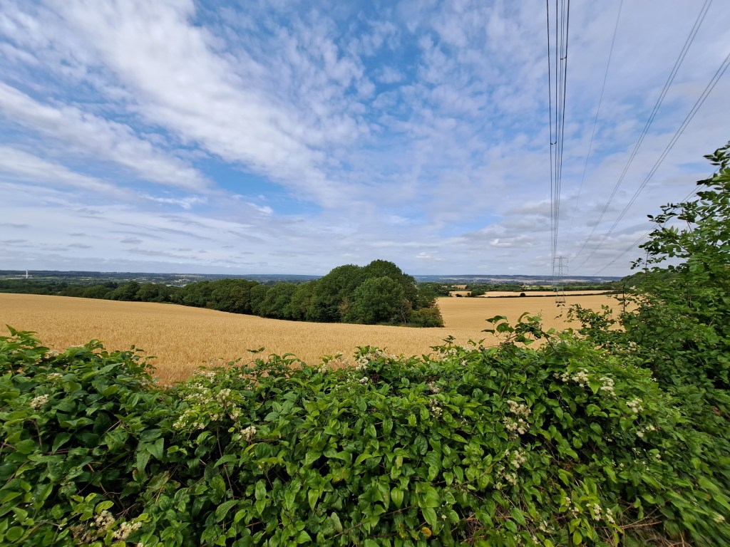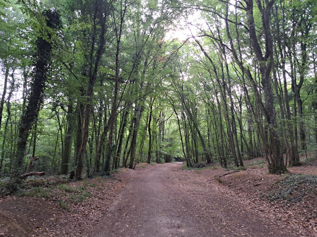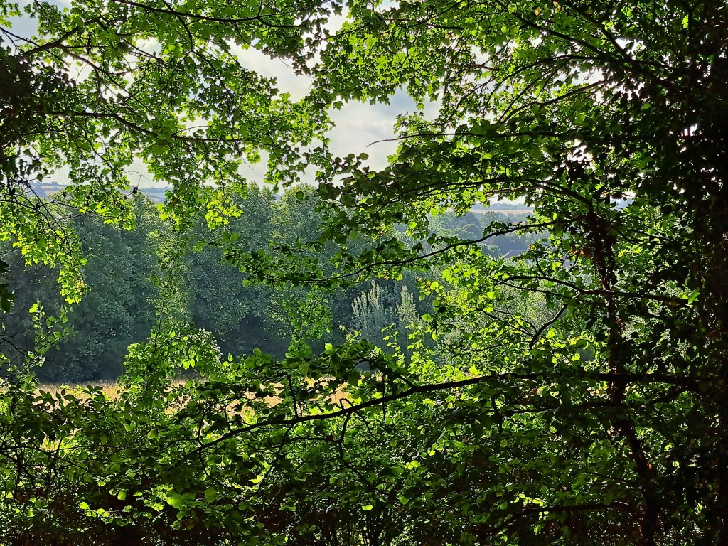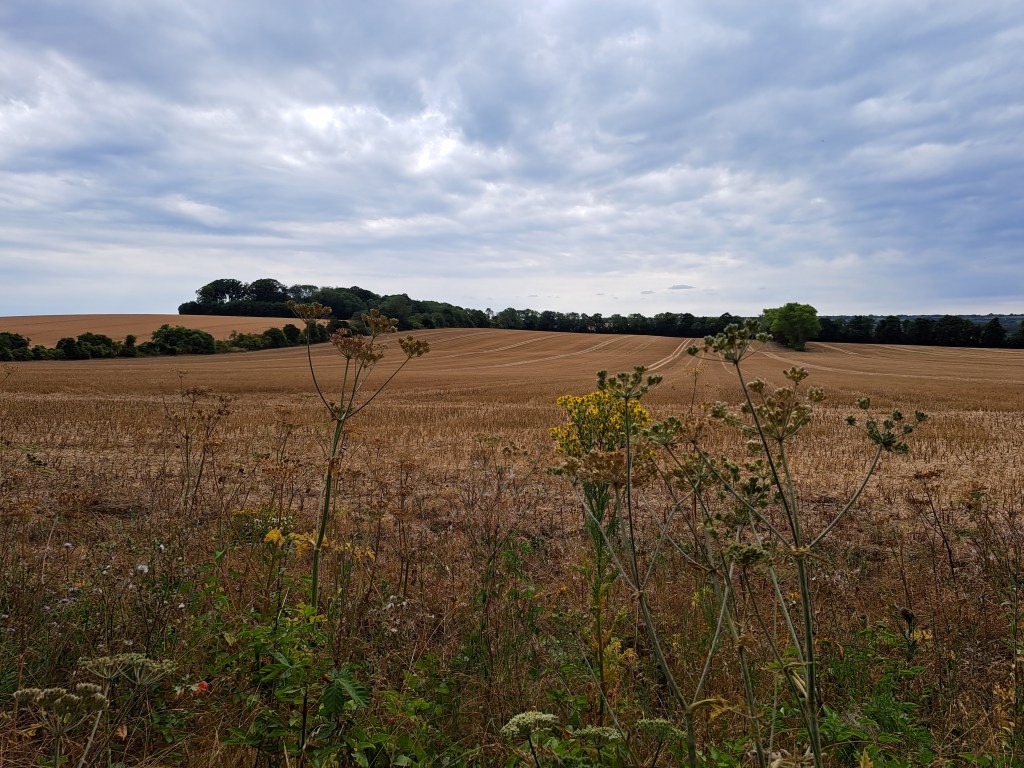 After long stages in forests and a few bouts beside large cultivated fields we found ourselves on the edge of an escarpment with great views along the valley below. So good to have a broader view of the world after hours enclosed in forests. I love forests and find them peaceful and quite mysterious, but the stepping out to a wider vista was very satisfying. I suppose the fact that I had been suffering from the very course and uneven paths liberally strewn with flint nodules and sharp, broken shards, helped make the break out feel so good.