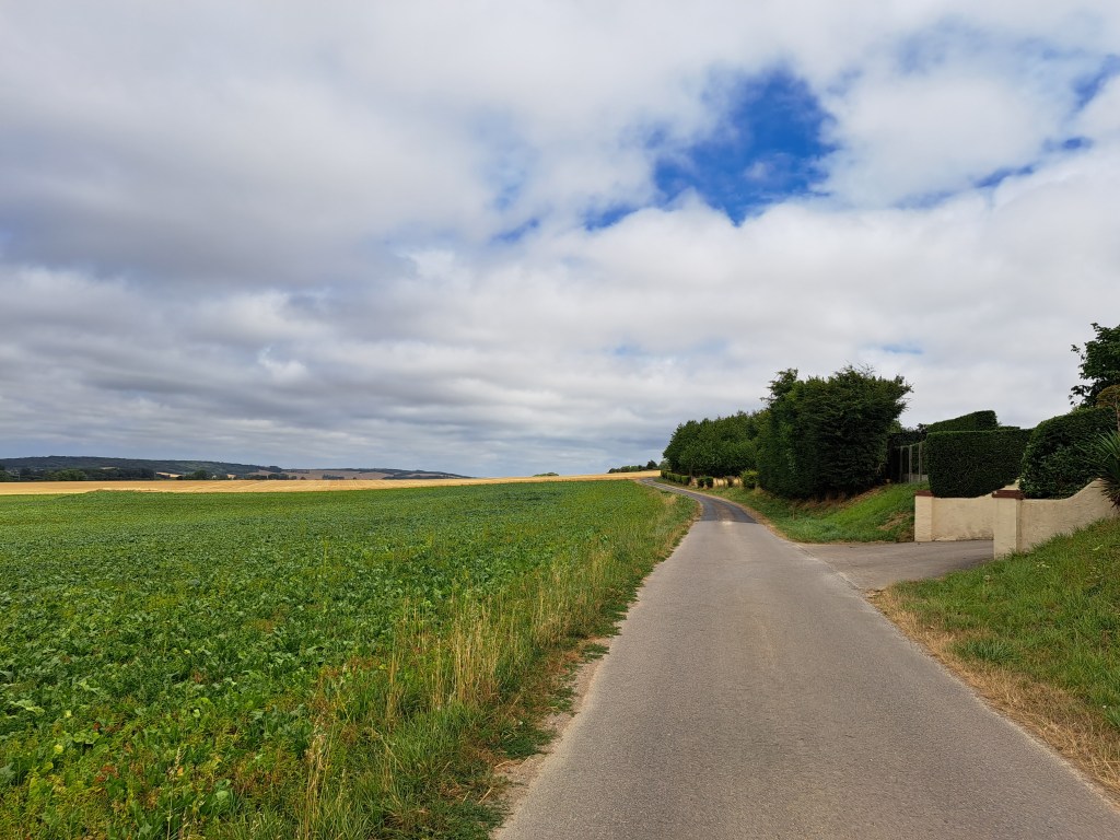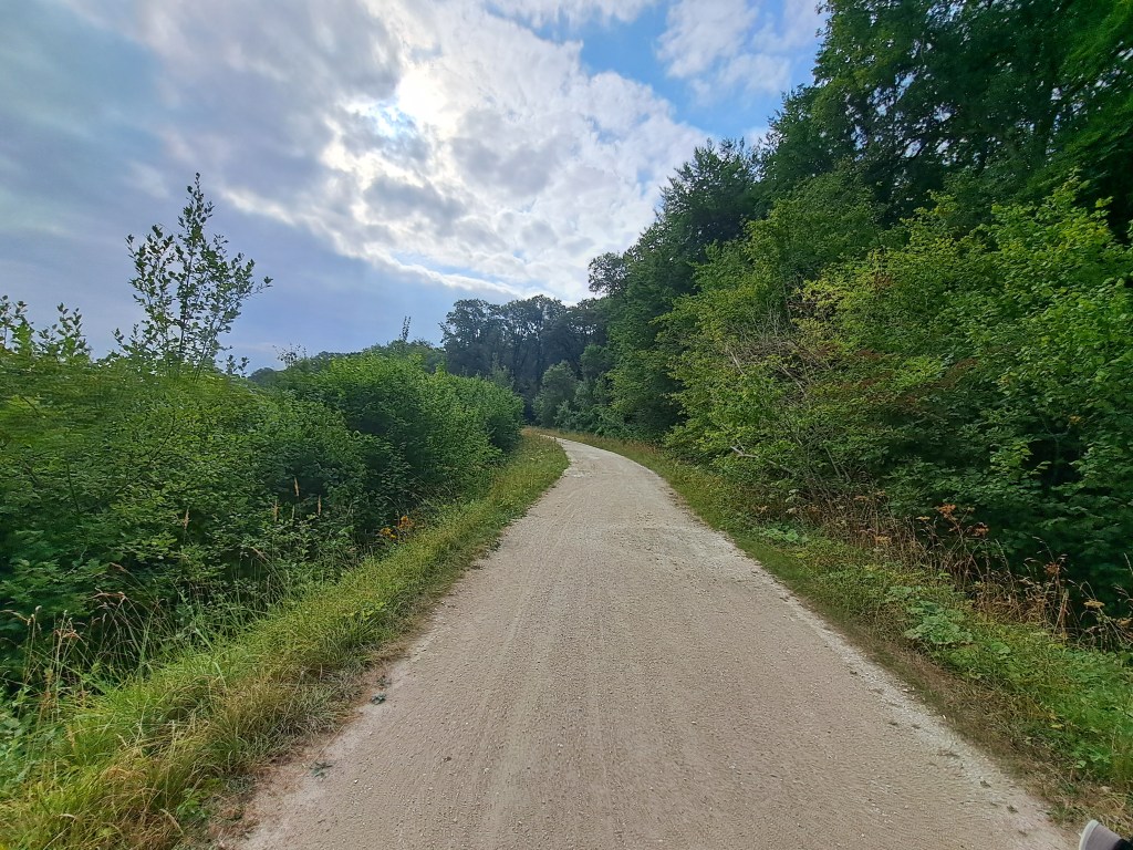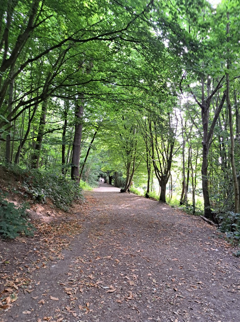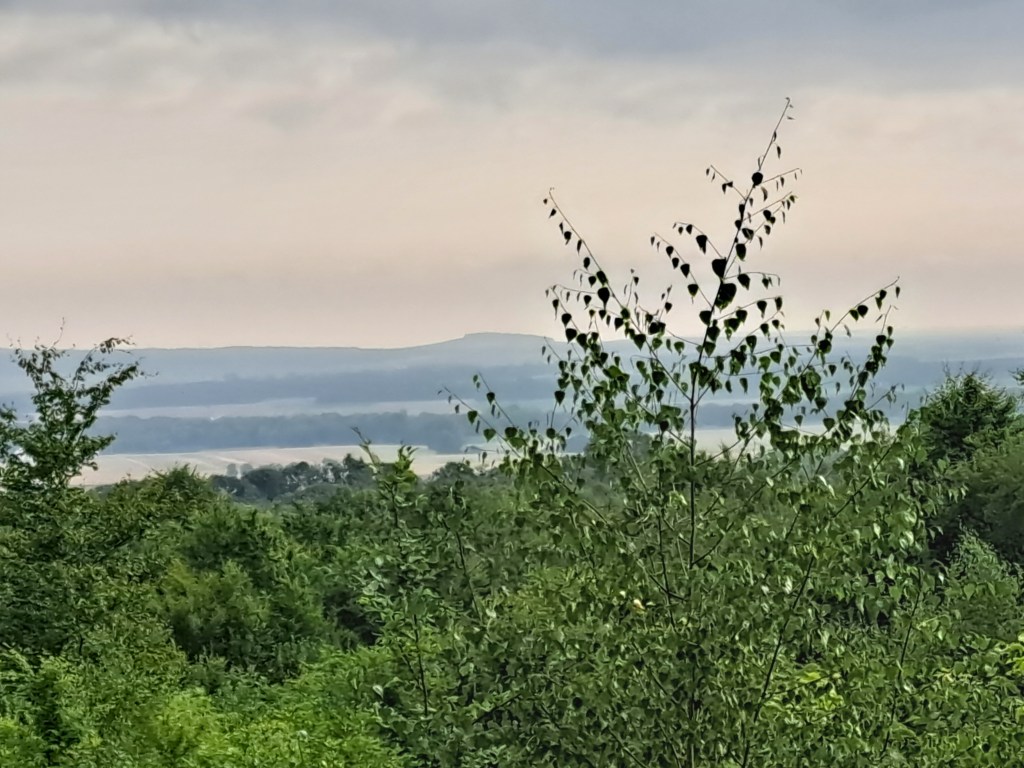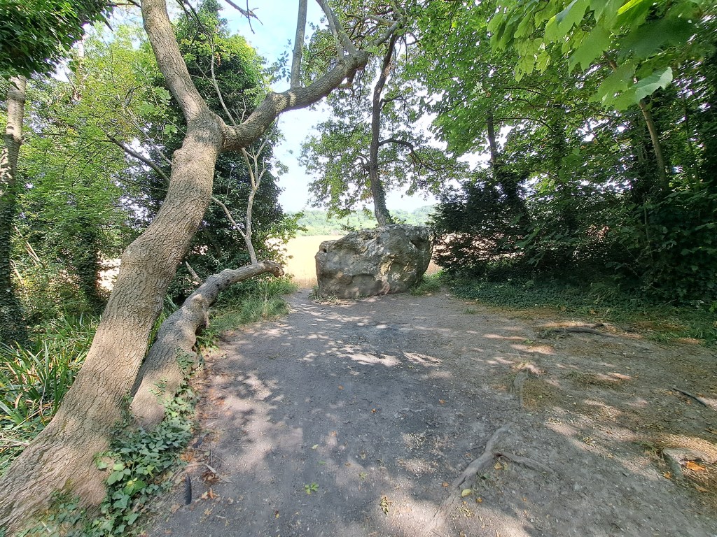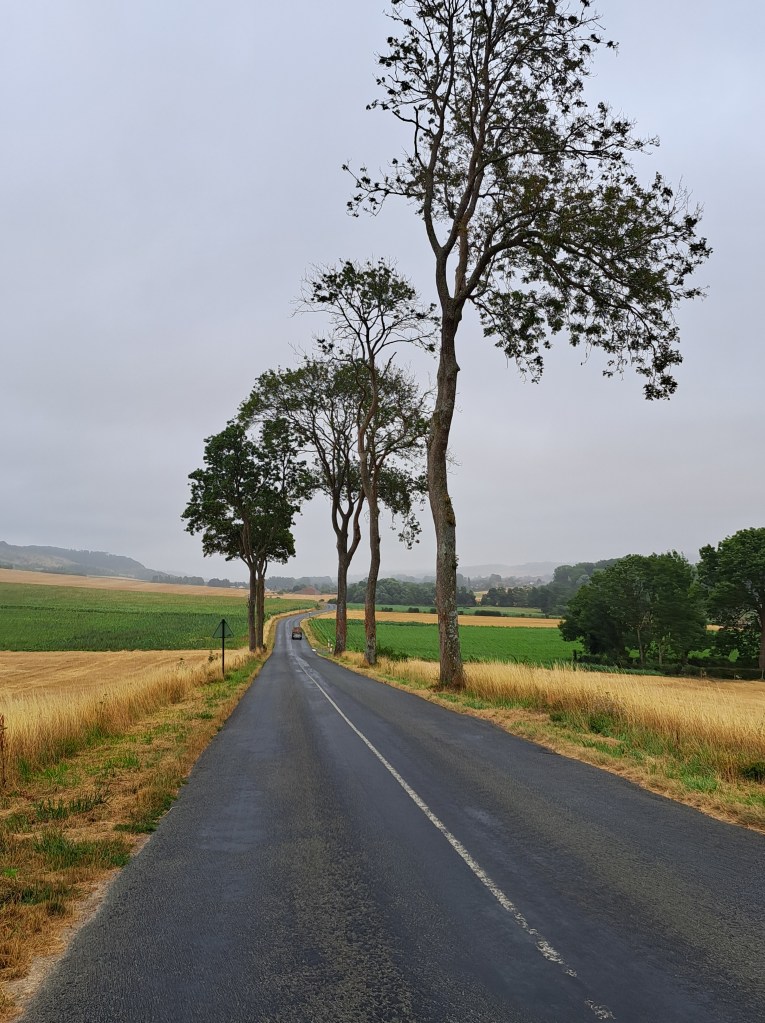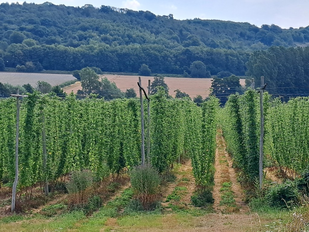 After long stages in forests and a few bouts beside large cultivated fields we found ourselves on the edge of an escarpment with great views along the valley below. So good to have a broader view of the world after hours enclosed in forests. I love forests and find them peaceful and quite mysterious, but the stepping out to a wider vista was very satisfying. I suppose the fact that I had been suffering from the very course and uneven paths liberally strewn with flint nodules and sharp, broken shards, helped make the break out feel so good.