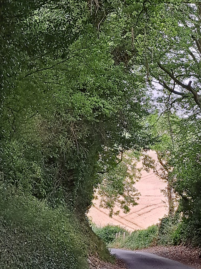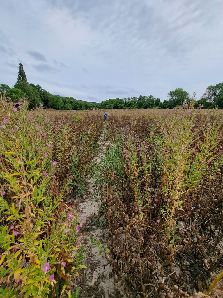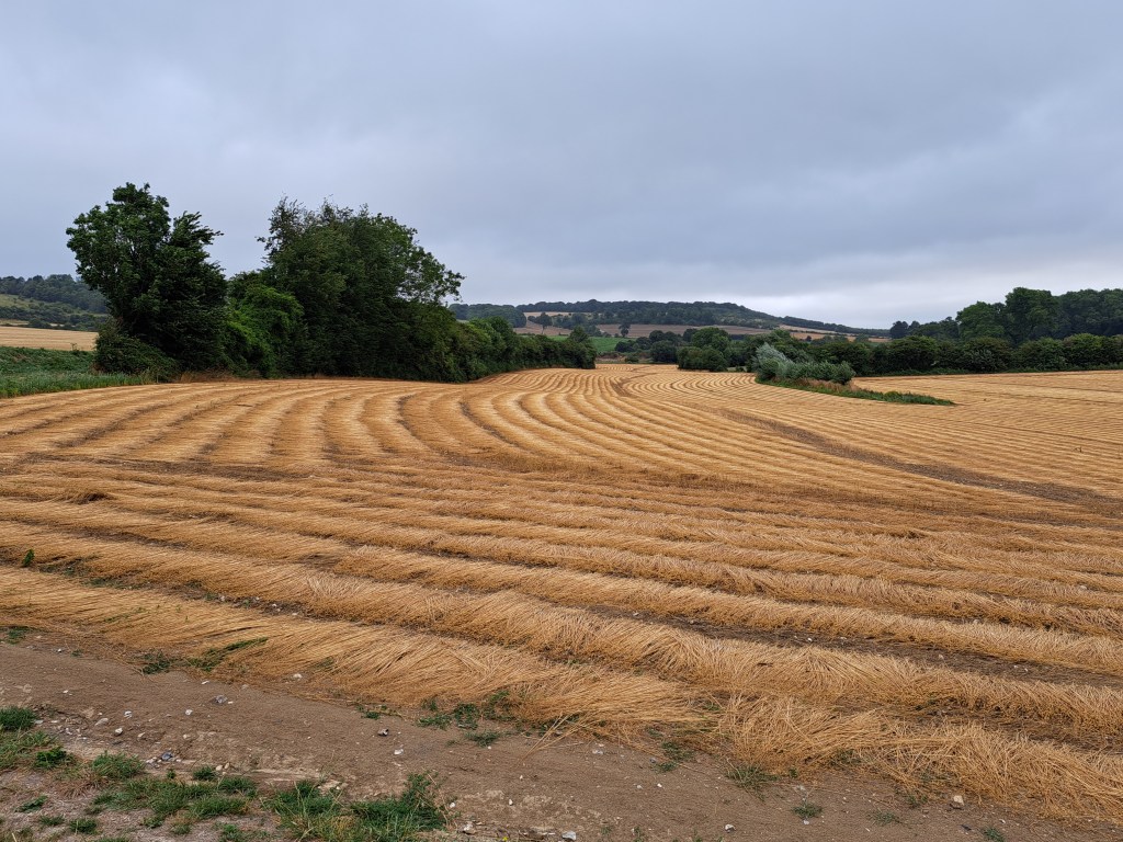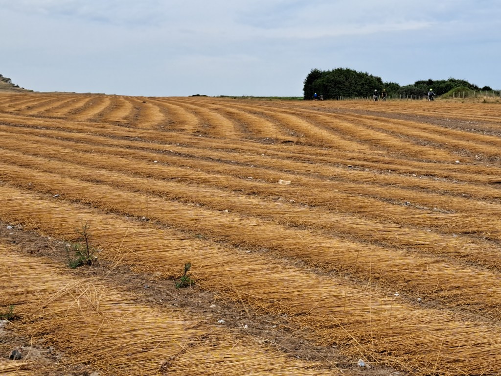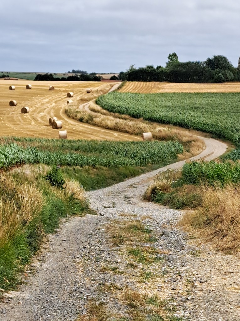 So, it is “keep it simple time”. I’m keeping my poems and thoughts in my little notebook for a while. Please look at the pretty pictures instead…. Oh, and if you can, please take note of the crop that has been cut and neatly laid in rows, forming wonderful chevrons across the earth. The thin stalks are topped off with little bunches of seeds that look quite like dried coriander seeds but they are not coriander…. What is this mysterious crop we have been walking past since arriving in France?