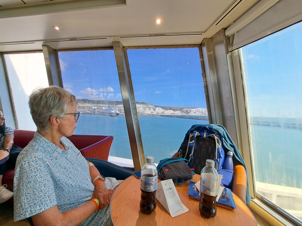 We are sitting at the front of the ferry as it pushes its way through the waters of the Channel. France was visible to us even before we set off and the coast is steadily becoming clearer as we go. There is an inevitability about the process that stops you from wondering if you will get there. We watched a container ship cross our path and a British patrol vessel seemed to pause to let us pass as we ploughed on along our well established course.