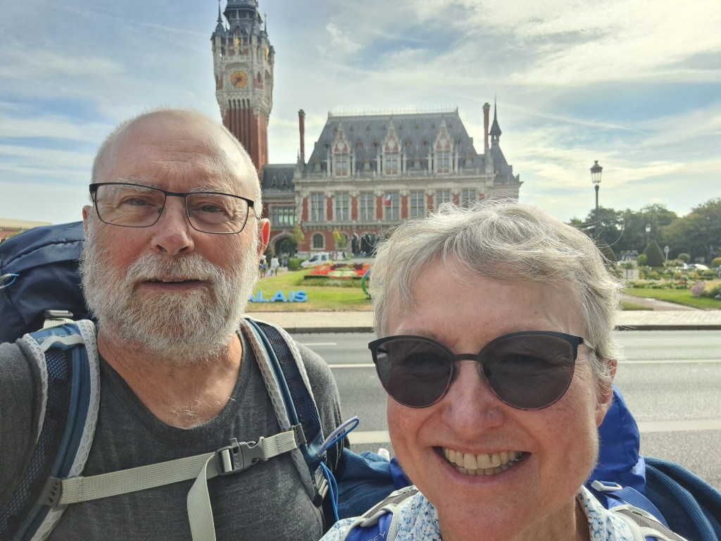 I am writing this in a fine city called Arras. We are staying in very small, one room apartment on the main square. Yesterday we were in a small farm yard gite/chambres d’Hotes where the lady who hosted us was very pleasant and helpful. She promised to seel us some potatoes and eggs (from her small holding) and we brought other ingredients and wine from the previous town and made a good meal with it and sat and ate with three Belgian women who were lovely – mother, daughter and aunt walking on the pilgrim route for a few days.
