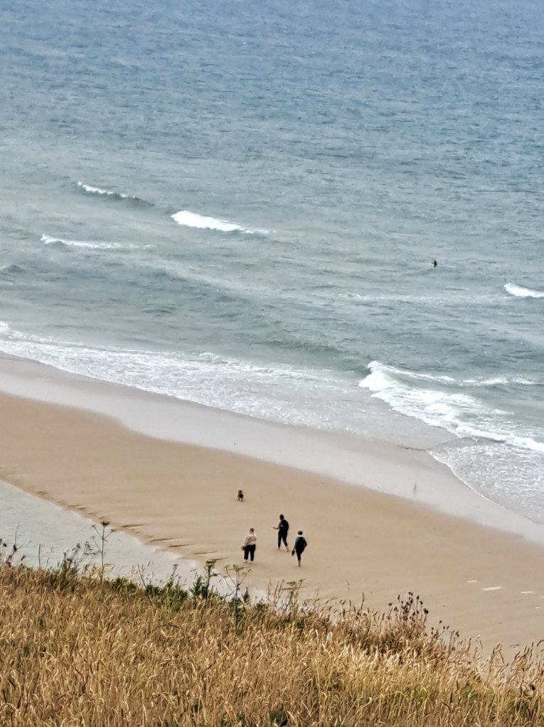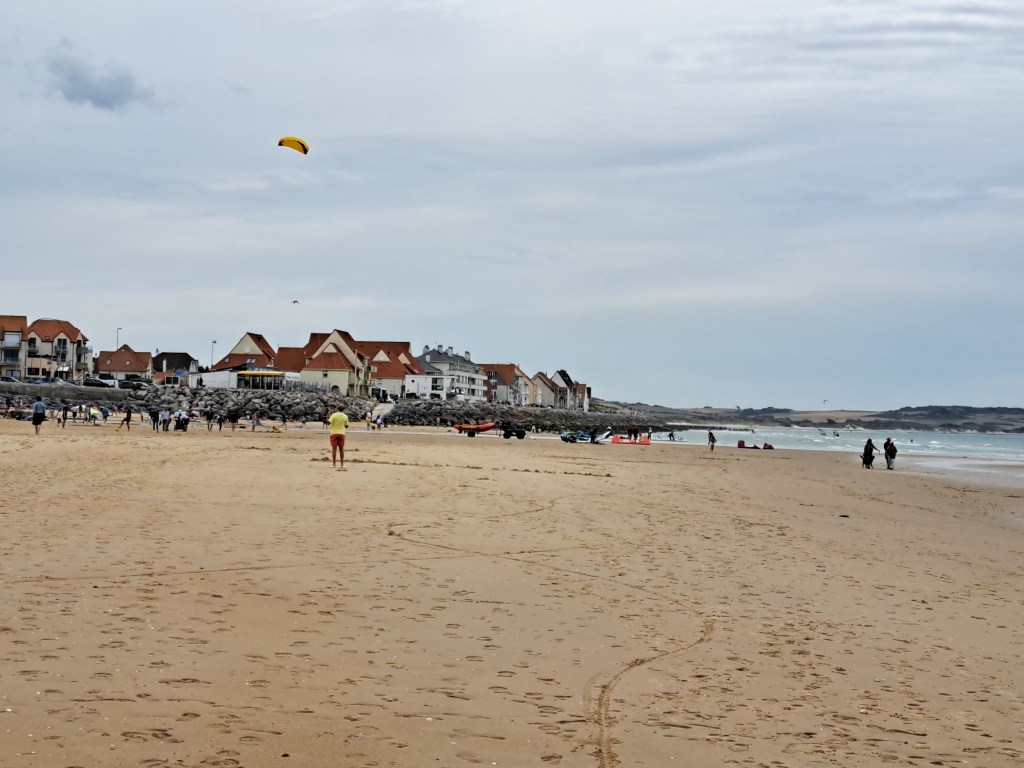 We re-joined the route on the cliffs, which was spectacular, and then finished the walk into Wissant on the beach, using the hard sand below the high tide line. Loads of people were doing exciting wind surfing, para-surfing and so on.