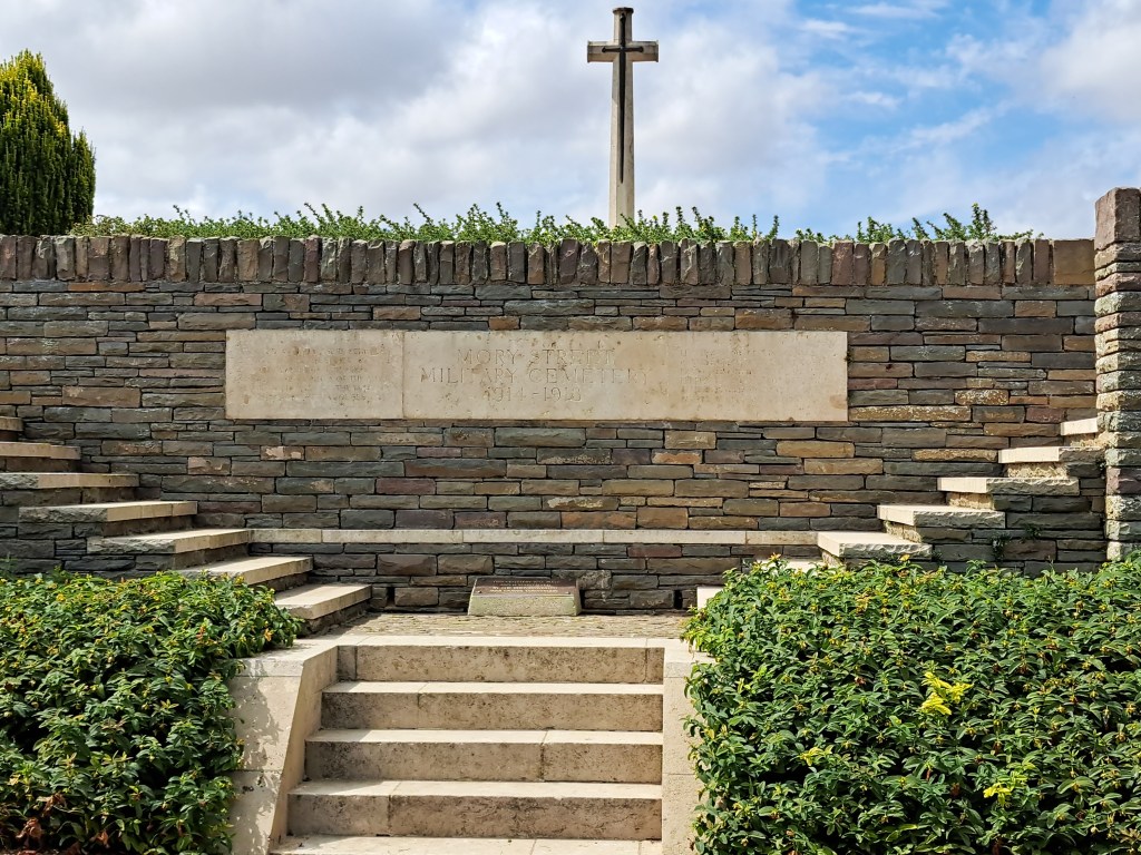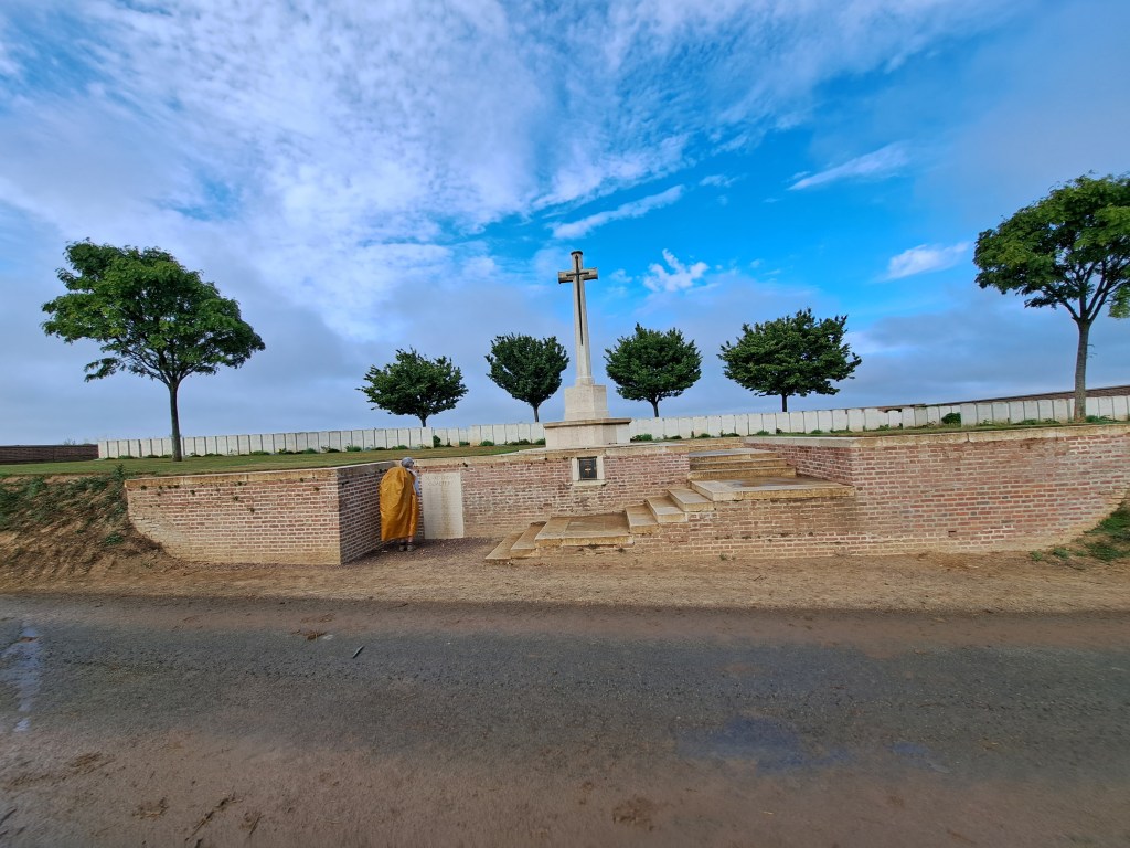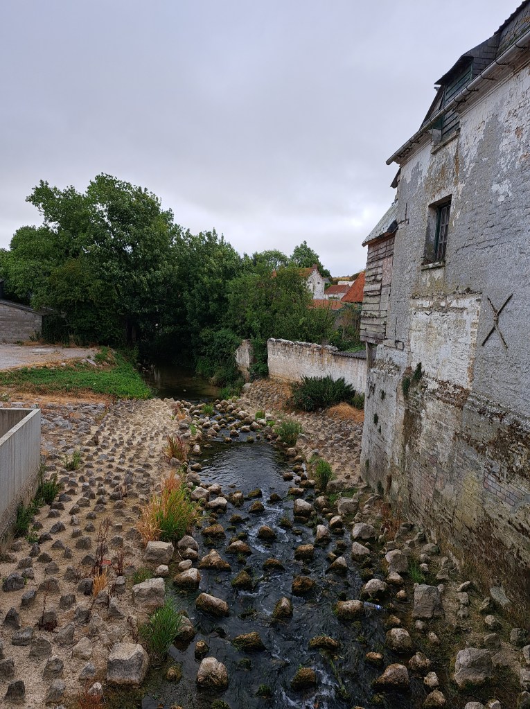 Today is the 5th August and we are now in a city called Peronne resting on the banks of the Somme. Yesterday was another long day from Arras to Ytres. We began walking in the rain at 8 am and gradually, as we walked through each village devoid of any services, the rain diminished and the sun grew in strength, the heat increased and the shade just faded as we walked. Our drinks faded too and, after lunch sitting in some blessed shade behind the war memorial at St Legere (a village that was awarded the Croix de Guerre because, despite being almost completely destroyed during WW1 the people kept on living positively and working as hard as ever alongside the rubble), we walked on to the another village where we knew there was a shop, a bar and other services. This place, Vaulx-Vraucourt had the services but they were all shut – even the shop was not going to open for almost an hour after our arrival (and we could not wait).