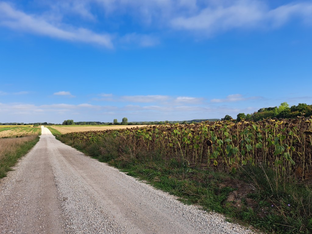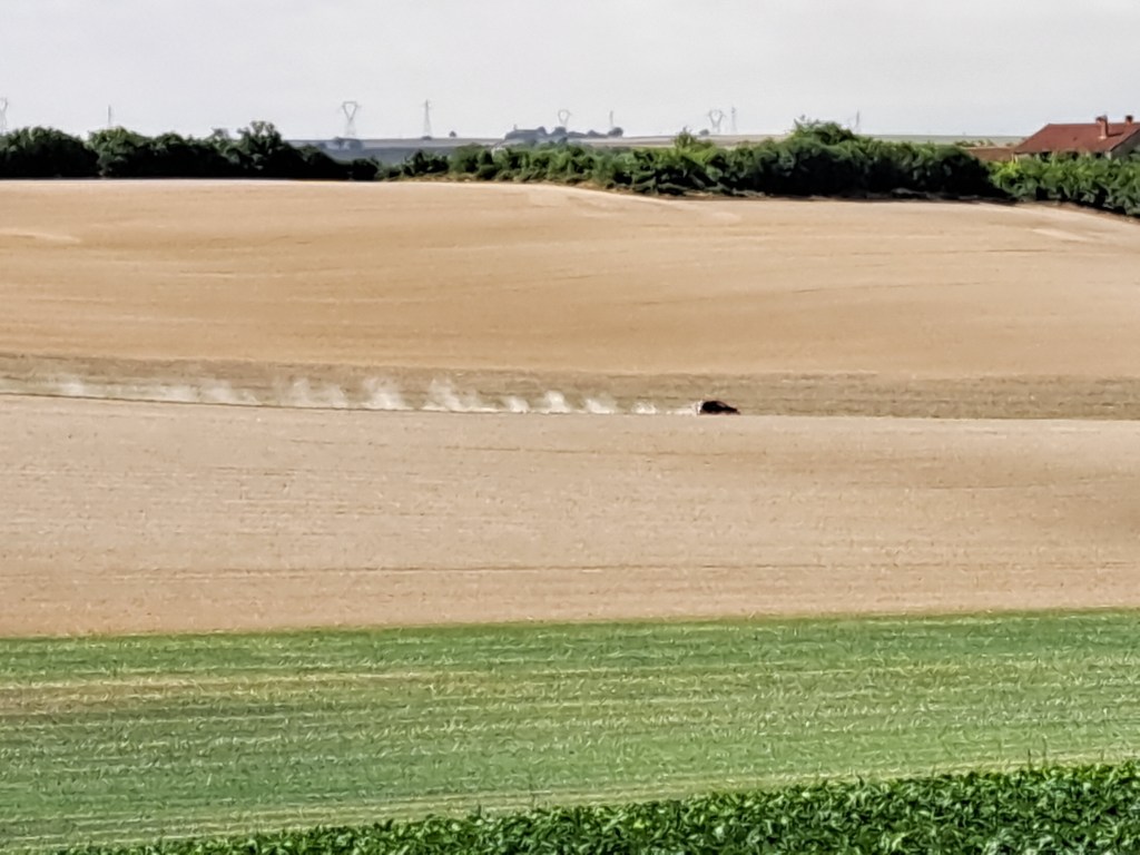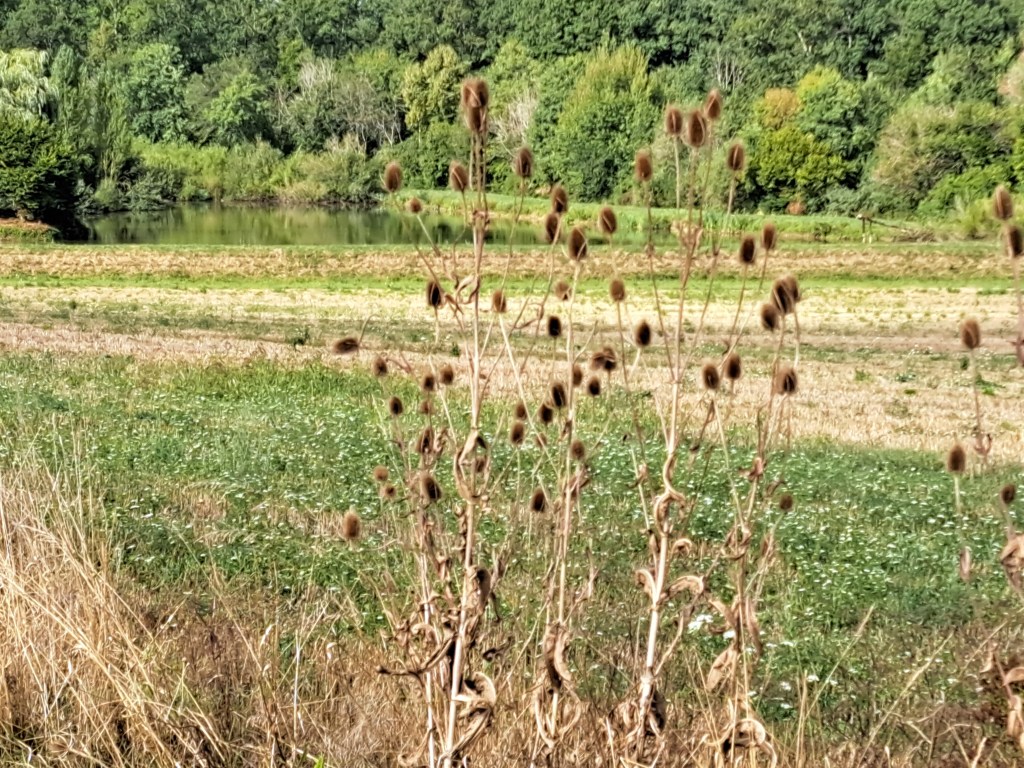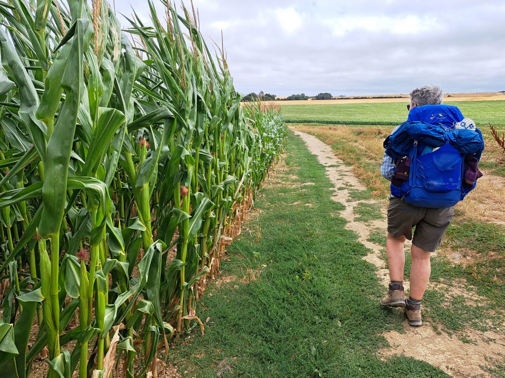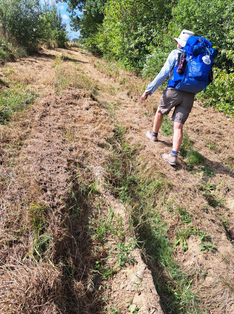 Just before I publish I also wanted to add that this region (l’Aube Champagne) is really lovely. The villages are seriously beautiful with amazing, mainly half-timbered churches that are all actually open, and despite having not shops, bars or boulangeries, they are well worth visiting (‘though I do work hard at trying to find a place with something!). The landscape is mainly rolling with some higher ridges a series of winding tributaries to the main river and some small and a couple of big lakes. It is partly wooded and mainly arable with the occasional small herd of cattle and the fields are vast, with some new additions to the usual crops of beets, maize and sunflowers (wheat, etc has already been harvested). The new crops include haricot beans and hemp. Interestingly, this morning we walked past a huge field of hemp, then onto a smaller, but longer field of now harvested hemp, but at the very end of the field was a small square of the stuff that looked quite different from the rest of the crop. A small square of, as yet unharvested “hemp”…. Anyway, in the woods we have encountered wild boar for the first time. We have known they were around since almost the first day in France but today we met three large ones and we were glad of the fence that separated us from them. They grunted and moved away but were impressive beasts. Great to see them, at last! We have also seen marmots and lots of other smaller creatures, so, despite the vast empty spaces there is still a lot of wildlife out there to encounter – and some of that wildlife carries rucksacks with shells on them…..