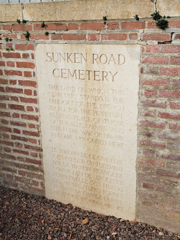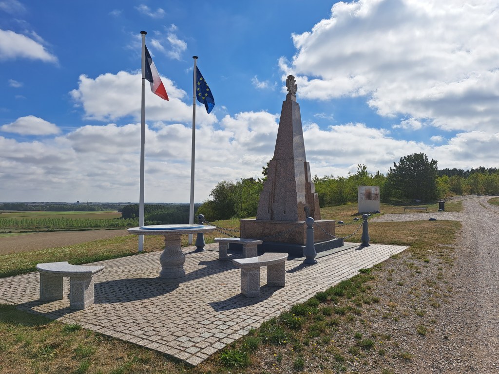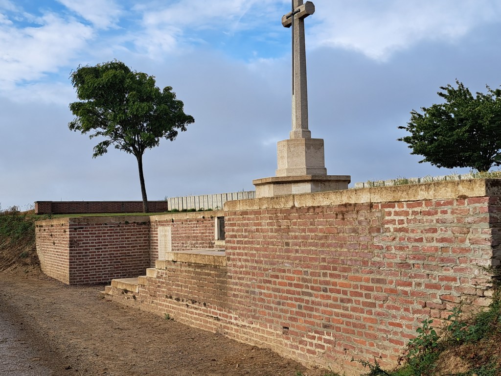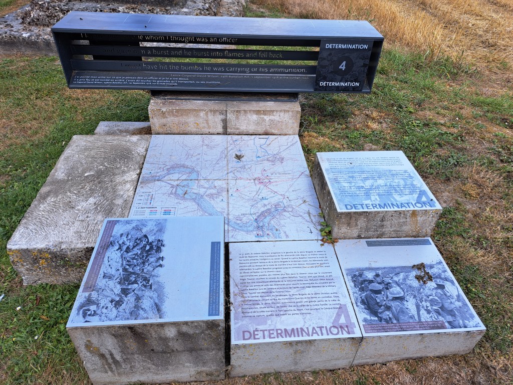 The last few days we have become very aware of the landscape’s heritage from the First World War. Although much of our day’s route followed an amazing canal (du Nord) we also passed sites relating to the war and then, just before entering the city we ended on a hill called Mont St Quentin which is a really important local WW1 Site for the people here. Peronne had been heavily occupied by the Germans during much of the war and then, early in 1918 they were liberated by the Australians who fought a seriously ferocious assault against the German occupiers and this hill was a major point of defence that had to be taken. The story of this conflict is extraordinary and deserves looking up. There were a series of small displays marking the progress of the Australians and on one panel it said “this ruined wall (near here) was the site of a German bunker. After the end of the fighting the soldiers entered the bunker to find the dead bodies of 30 German and 2 Australian soldiers”.