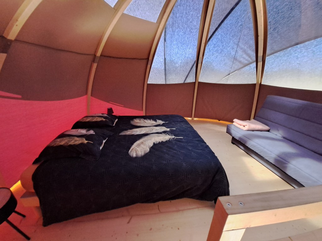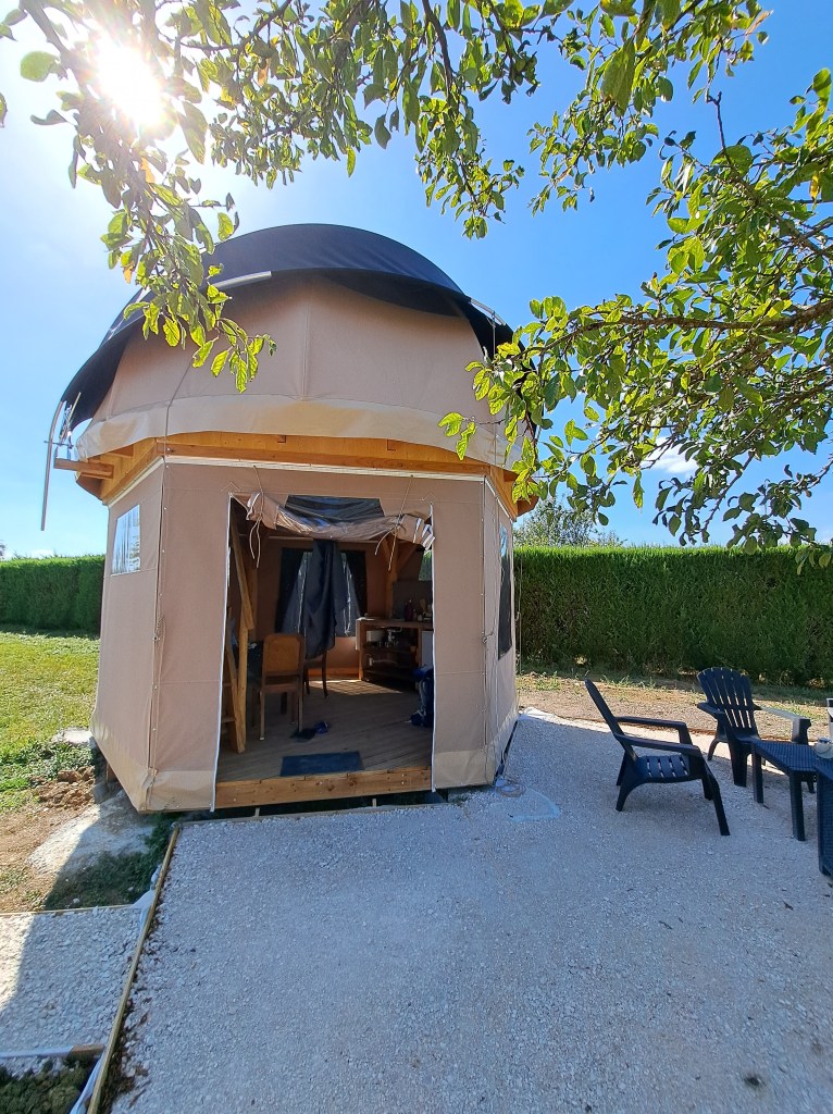 Last night we stayed in a new place (opened in July) run by lovely couple who have taken a farm house and farm yard and are running it as an eco-friendly gite d’etap. They live in the large square house made of brick and dating from the end of the 19th century. It is connected to the half-timbered barns and farm worker’s cottages by a huge, half-timbered gateway and beyond the farm yard and behind their house they have set out a series of three big, modern dome-shaped, wooden-framed tents (called boules in French) with all facilities and a double-decker tent looking pretty much like a champagne cork where we were staying. The farm worker’s cottages is a separate gite they rent out, too. Beside the tents there is a pool with a sliding, arched cover and there is also a large jacuzzi.